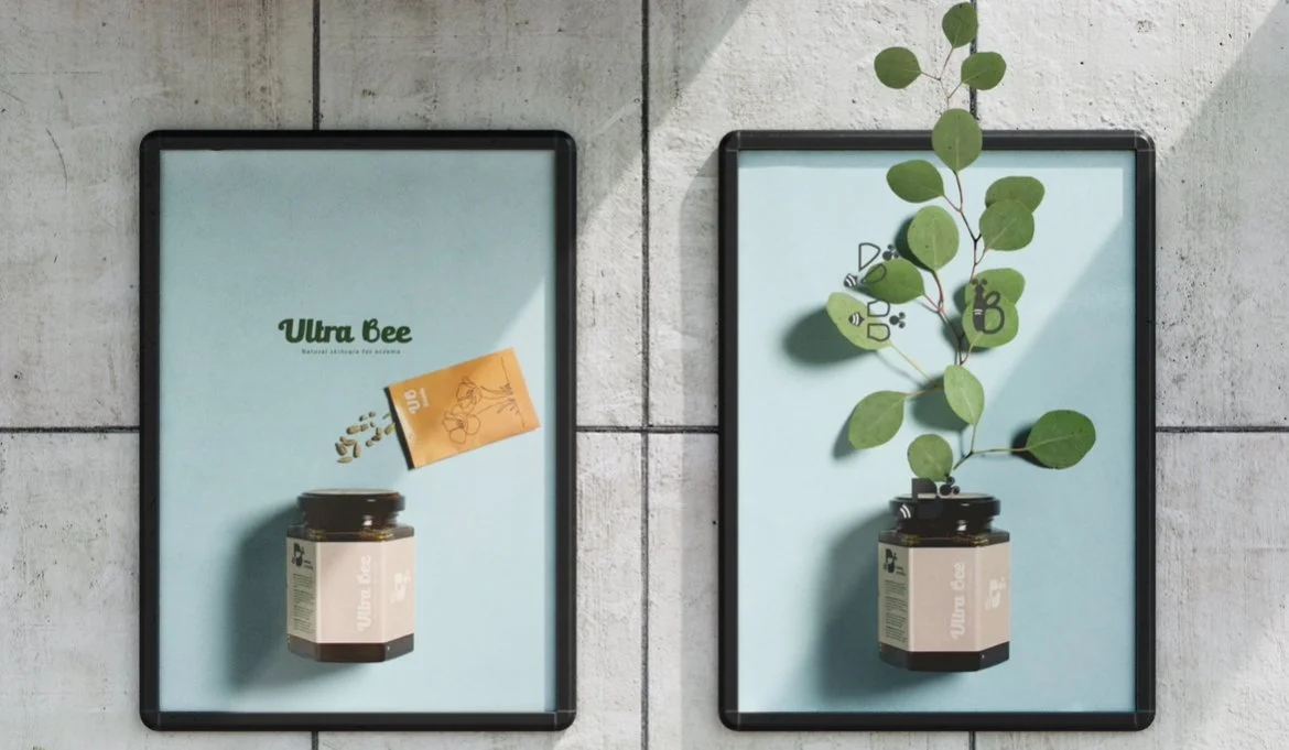 Ultra Bee is a company specialising in eczema cream formulated with beeswax. The recent rebrand has revitalised the brand identity, infusing it with new energy. This collaborative project with a like-mind- ed peer who shares the same interests in branding, advertising, and motion graphics, stemmed from our shared experience with eczema. Our product not only heals with the natural properties of honey but also offers a sustainable ecosystem by providing seeds with every order.